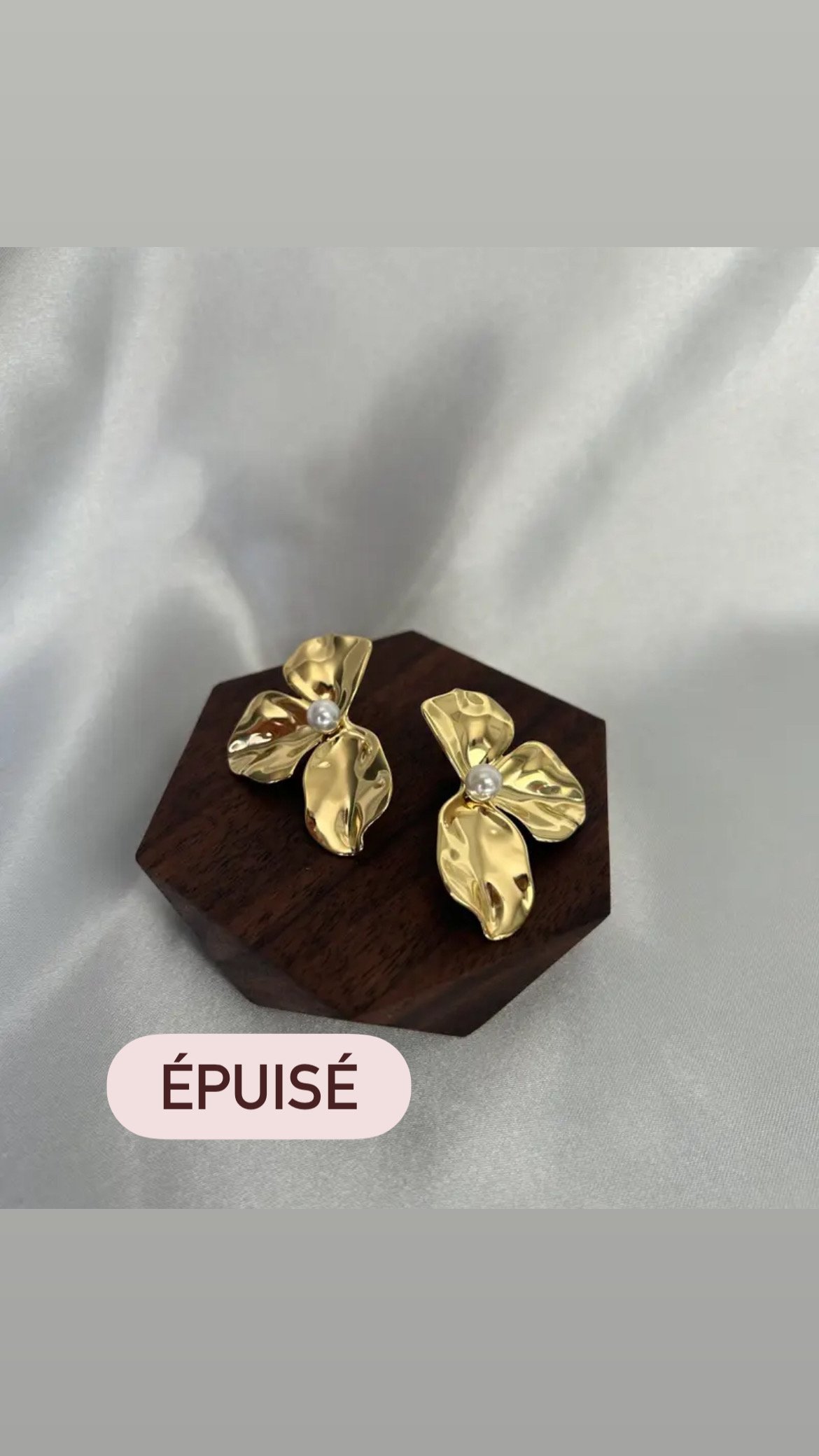 Boucles d’Oreilles Pendantes Dorées Demi Fleur Et Perle Blanche Au Centre.
