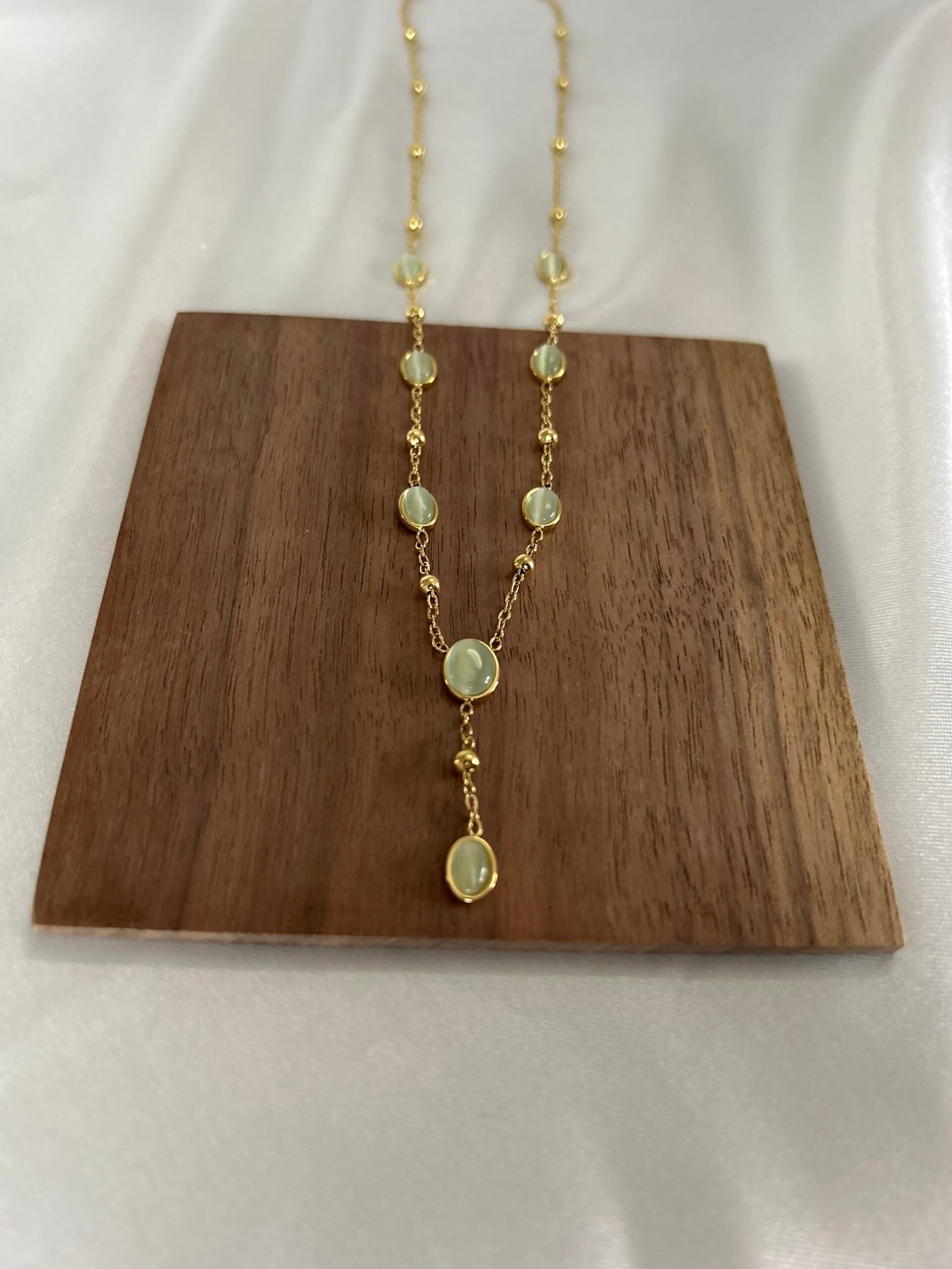 Collier chaîne dorée en Y avec multiples pierres œil de chat bleu